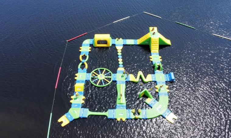 It's a real amusement park on water, with a capacity for up to 80 people at the same time, and features a catapult, giant tower, slide, diving board, springboard, zig-zag, obstacle course, inverted ladder, climbing wall... and plenty of slides and fun!