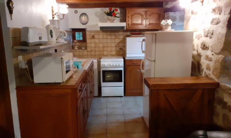 Self-contained gîte on enclosed grounds of approx. 100 m². 1 bedroom (1 double bed, 1 single bed), living room with kitchenette, sitting area, microwave, enclosed grounds, parking, terrace, electric central heating, wood-burning stove.