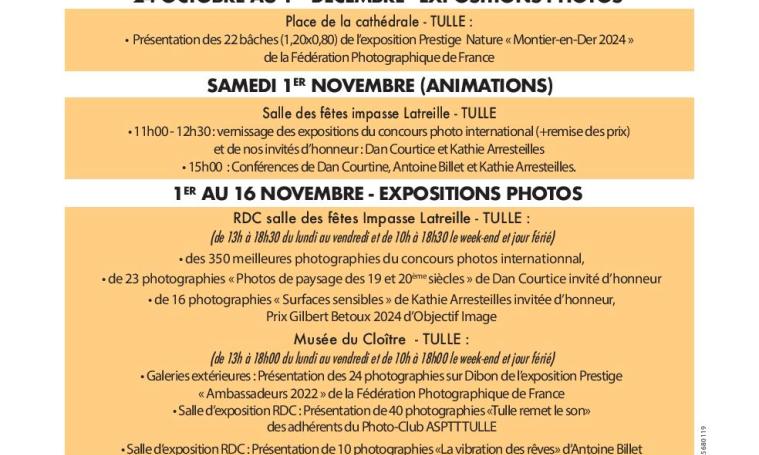 24 octobre au 1ᵉʳ décembre : expositions photos, Place de la cathédrale - Présentation des 22 bâches de l'exposition Prestige Nature "Montier-en-Der 2024" de la fédération Photographique de France – samedi 1ᵉʳ novembre (animations) Salle Latreille : 11 h /12 h 30 vernissage des expositions du concours photo – et de nos invités d'honneur : Dan Courtice et Kathie Arresteilles - 15 h : Conférence de Dan Courtine, Antoine Billet et Kathie Arresteilles - 1ᵉʳ au 16 novembre - Expositions photos - RDC salle Latreille (de 13 h à 18 h 30 du lundi au vendredi et de 10 à 18 h30 le week-end et jour férié) Musée du cloître (de 13 h à 18 h du lundi au vendredi et de 10 h à 18 h le week-end et jour férié) -