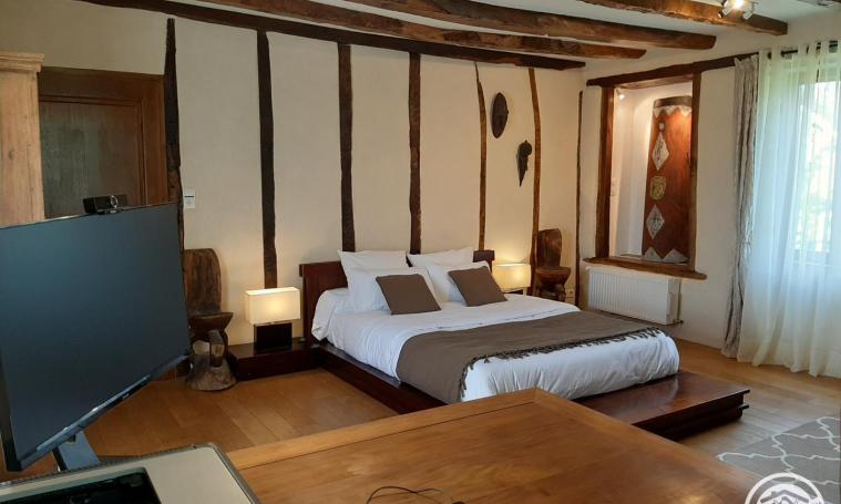 Step into a house of Correze heritage, discover Papuan art, go for a walk, a run or a bike ride in a preserved natural environment. The house has been designed for family living, in the peace and quiet of a small village, and its facilities and unique decor will give you a change of scenery and help you recharge your batteries. Depending on the season, you'll be able to enjoy the shade of the large trees, the half-shade of the shrubs or the sunny areas; taste the many fruits (raspberry, redcurrant, cherry, plum, fig, etc.), listen to the calm of nature and the song of the birds as you breathe in the pure air. Restored with a majority of natural, noble materials, the terracotta floors, oak floors and whitewashed walls guarantee a healthy indoor atmosphere.