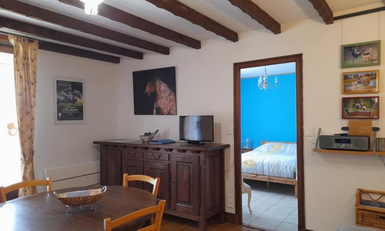 Notice to horse lovers and especially race lovers, this apartment, particularly well located overlooking the racetrack, also offers a breathtaking view of the castle of Pompadour. Located on the garden level of the owners' house, it can accommodate 2 people and is composed of a comfortable living room, a kitchenette and a spacious bedroom. A beautiful terrace completes this pleasant and functional set.