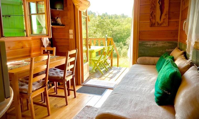 all-wood caravan, great comfort: fully-equipped kitchen and 2 90cm-wide sofa beds, corridor leading to shower room and toilet, bedroom with 160cm-wide bed, uninterrupted view over the countryside, peace and quiet guaranteed.swimming pool shared with Charlotte's gîte and the owners. Electric bikes with helmets and baby chairs are available for riding on our country roads! Close to Terrasson, Vézère valley, Lascaux caves, Sarlat, Périgueux, Brive, Pompadour, Collonges la Rouge, Rocamadour and the Gouffre de Padirac We border 3 départements: Corrèze, Dordogne, Lot Cows, horses, chickens, rabbits, dogs and cats - that's country life! Electric bikes available on site Boules pitch. Meals available on request: 26?/adult