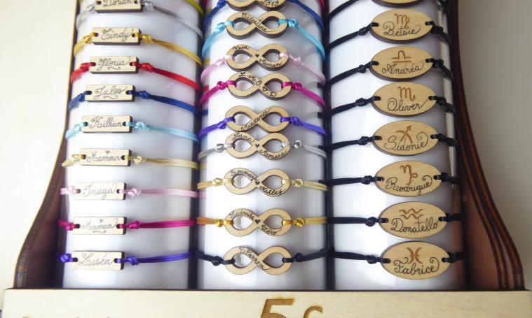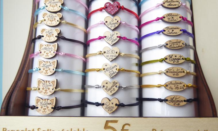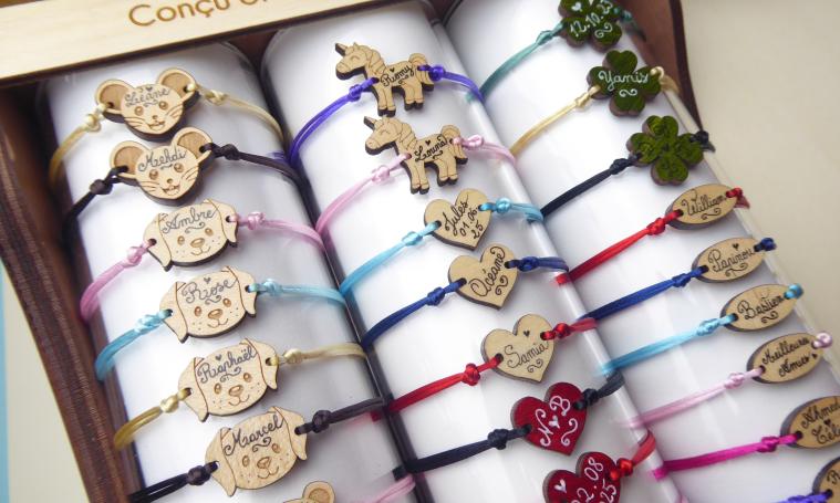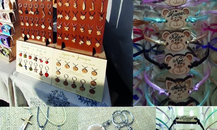 She also creates jewelry and key-rings in wood and Plexiglas, available exclusively at craft fairs and markets.