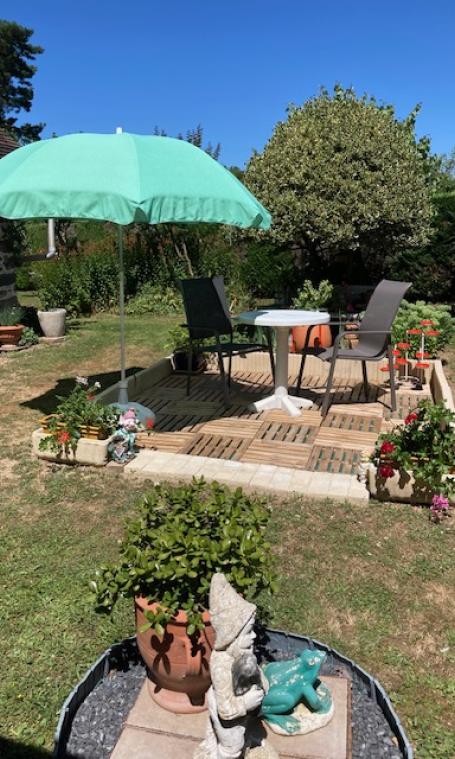 Outside, you'll enjoy a pleasant space with garden furniture and parasol, perfect for relaxing outdoors.