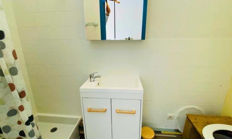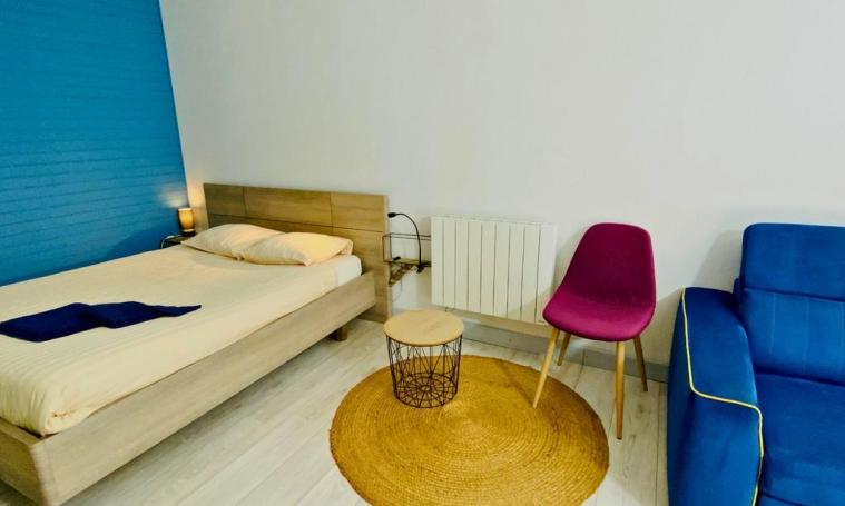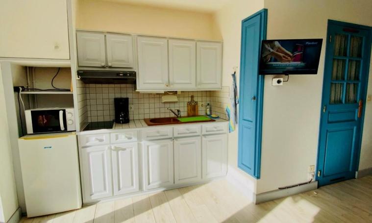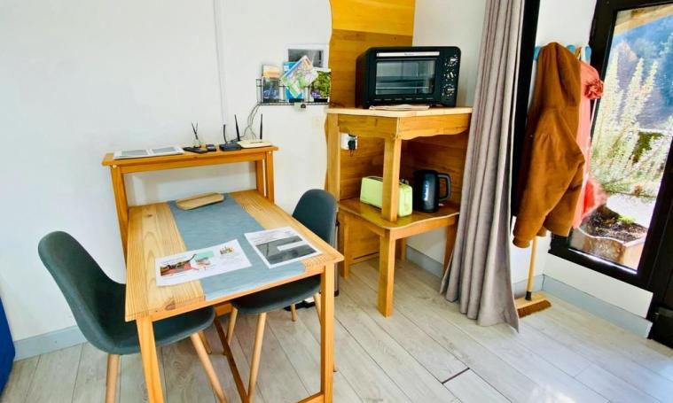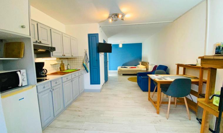 There are several vacation accommodations on site, including a single-storey studio at number 1. It features a well-equipped kitchenette (mini-oven, ceramic hob, small appliances), a dining area, a comfortable armchair (connected TV, Wibox subscription) and a 140cm bed. A large closet and a shower room/dry toilet complete this simple, functional unit.