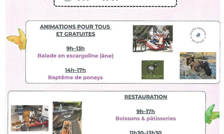 Animations pour tous et gratuite - 09 h à 13 h : Balade en escargoline (âne) - 14 h à 17 h Baptême de poneys - Restaturation : 09 h à 17 h Boissons et pâtissries - 11 h 30 à 13 h30 : Food-truck "vo kitchen" : hot-dog/frites - Toute la journée : Producteurs et artisans locaux - Vide grenier - Tombola et pêche à la ligne -