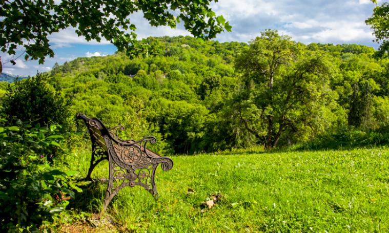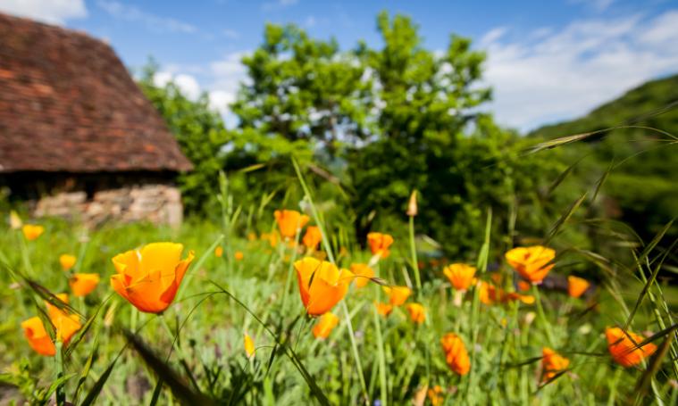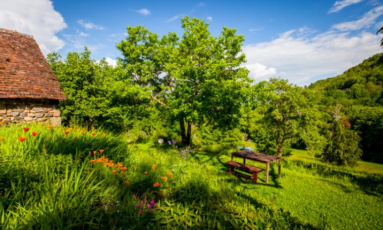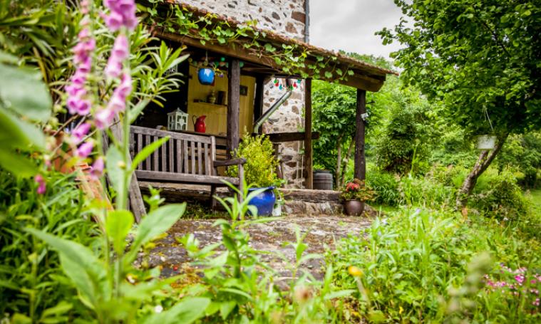 Grand terrain en pente aménagé en terrasses, avec construction en matériau de récupération d'un chalet/véranda avec canapé et fauteuil pour profiter de l'extérieur, douillettement installé à l'abri.