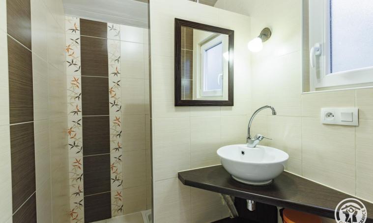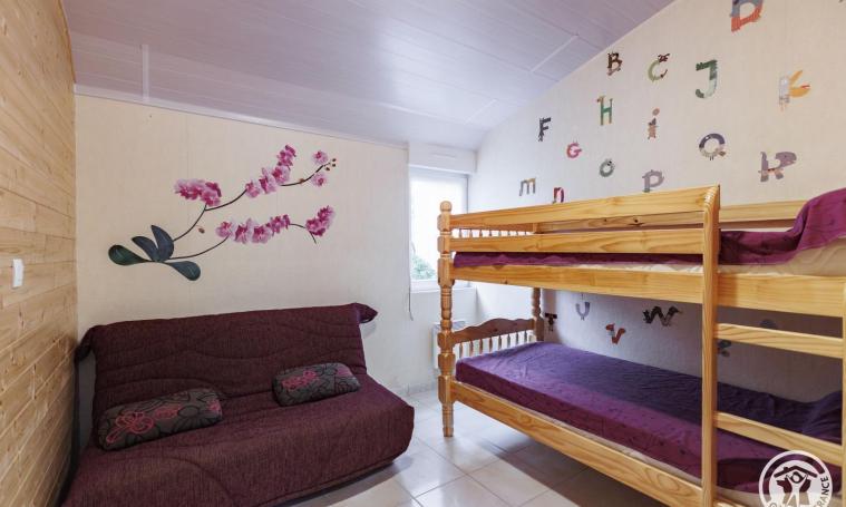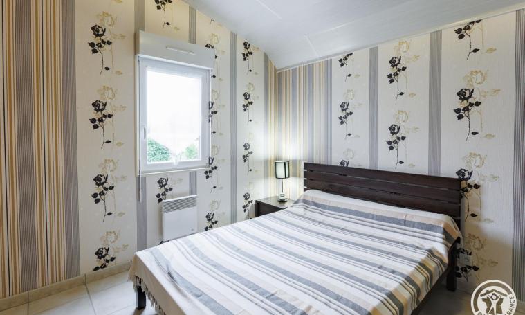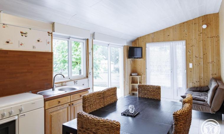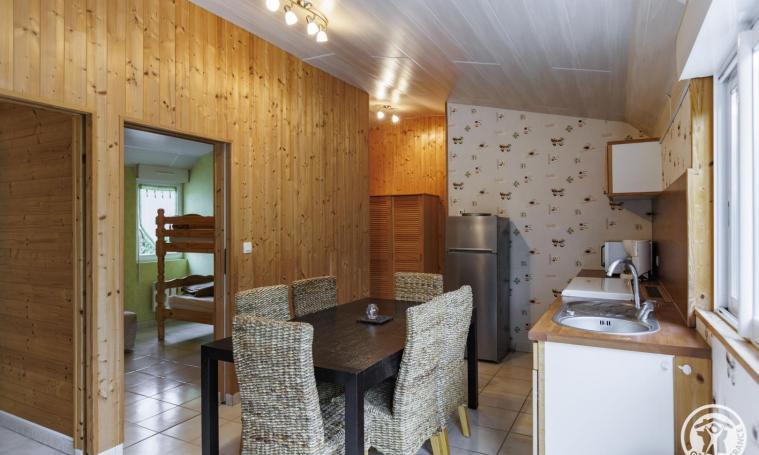 Après deux marches, vous accéderez à un logement de plain-pied, comprenant une pièce de vie avec une cuisine équipée (une gazinière, un lave-vaisselle, un micro-ondes, un réfrigérateur, une cafetière à filtre et un grille-pain), ainsi qu'un salon et un séjour dotés d'un canapé et d'une télévision. Le logement dispose de deux chambres : l'une avec un lit double et une grande armoire, et l'autre avec un lit superposé et un canapé BZ. Pour votre confort, une salle d'eau avec douche et des toilettes indépendantes sont également à votre disposition. À l'extérieur, une terrasse aménagée, équipée d'une table, de chaises, d'un salon de jardin, de transats et d'un barbecue, vous invite à profiter des journées ensoleillées et du cadre naturel environnant. Le prix ne comprend pas : chauffage, électricité, draps, linge de toilette