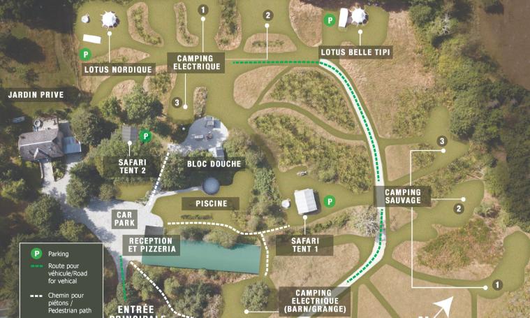Le camping propose plusieurs grands emplacements informels ainsi que quatre hébergements glamping uniques :