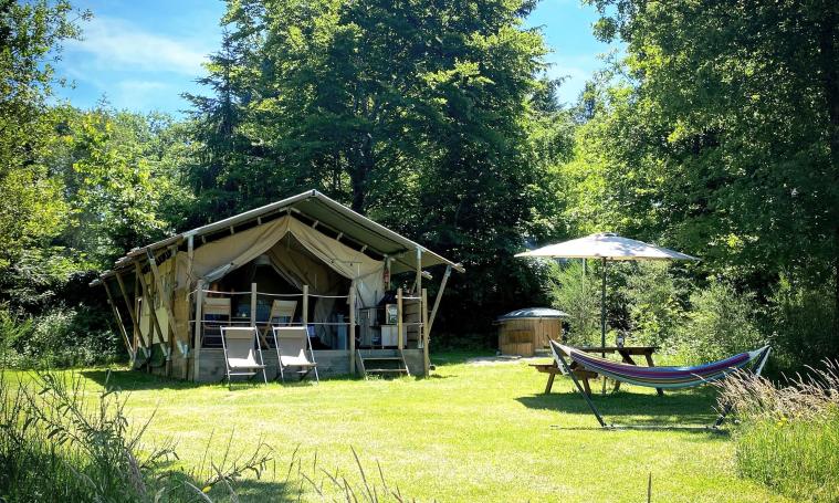 1 tente Lotus Belle avec bain nordique privé, idéale pour une escapade paisible