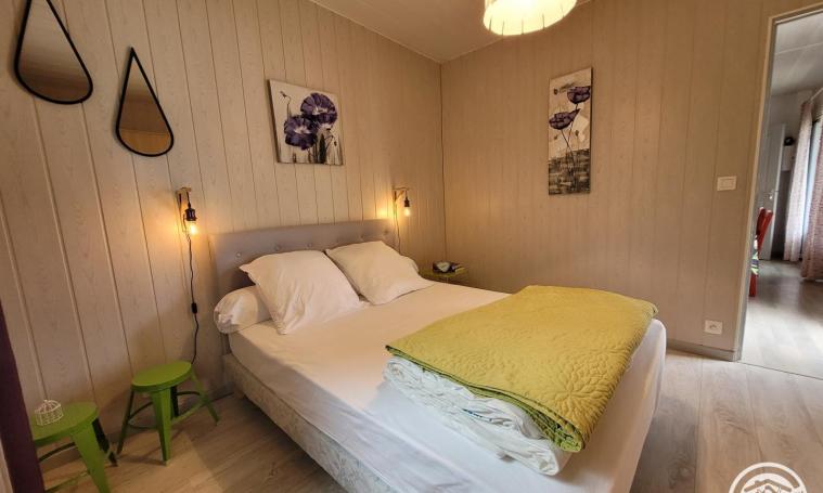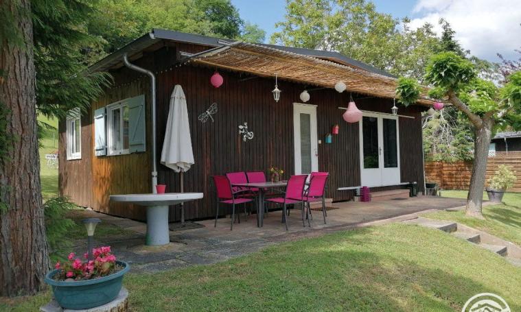 Joli chalet pour 4 personnes refait à neuf, dans un écrin de verdure, au calme avec jeux pour enfants (trampoline, balançoire, table de ping-pong, vélo pour enfants etc...), Il se compose: d'une cuisine/salle à manger entièrement aménagée et équipée avec grille pain, bouilloire, micro-ondes, four, cafetière Senseo donnant sur la terrasse couverte avec barbecue, 2 chambres avec lits de 140 dont une avec un coin salon, une salle d'eau avec wc, Wifi gratuit. Un lave-linge disponible en partage avec un second hébergement. Matériel bébé à la demande : lit bébé en bois (avec son matelas), chaise haute et baignoire.