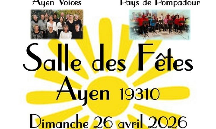 Concert de deux chorales : The Ayen Voices et Ensemble Vocale du Pays de Pompadour. Dimanche 26 avril à 17h gratuit (collecte en fin de concert). Salle des fêtes d'Ayen