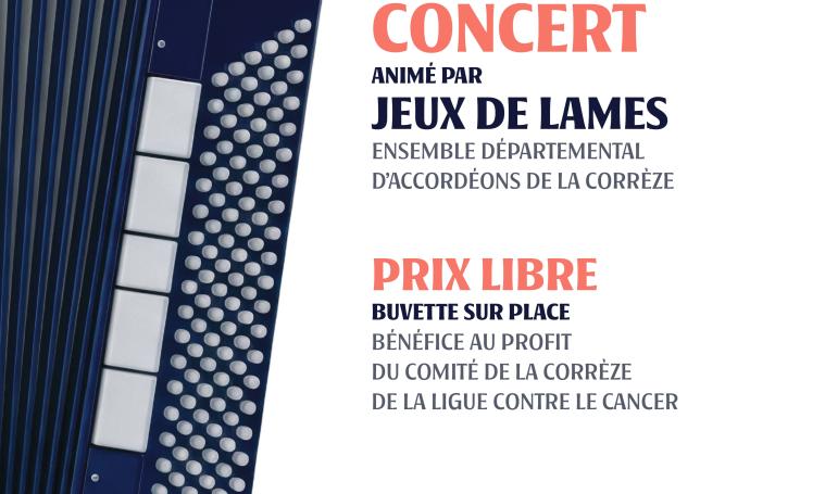 Dans le cadre de Mars Bleu, mois national dédié à la sensibilisation au dépistage du cancer colorectal, venez assister au concert solidairelors d'une soirée animée par Jeux de Lames, Ensemble départemental d’accordéons de la Corrèze. L’entrée est à prix libre et les bénéfices seront reversés au Comité de la Corrèze de la Ligue contre le cancer. Une buvette sera proposée sur place.