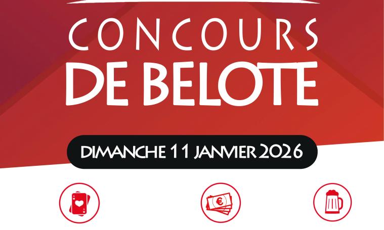 L'association des parents d'élèves, "La ronde du canton" organise un concours de belote avec de nombreux bons d'achat à gagner : 1er lot 200€, 2ème lot 100€ et 3ème 60€