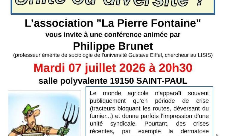 Quelques éléments pour une approche historique et contemporaine d'une profession plurielle. Bien souvent, le monde agricole n'apparaît qu'au rythme des crises qui le traversent, lorsque spectaculairement, les tracteurs bloquent la ciculation routière, ou vont décharger du fumier devant les préfectures. Bien souvent, aussi, il ne semble alors parler que d'une seule vois syndicale, comme s'il voulait montrer la force de son unité. Pourtant tout récemment, face pas exemple à la dermatose nodulaire bovine, maladie très contagieuse, des stratégies de mobilisation agricole opposées ont vu le jour, montrant à l'inverse, un paysage syndical très fragmenté et divisé. La conférence se propose de revenir sur quelques aspects de l'histoire du mouvement syndical agricole en France mais aussi particulirement en Corrèze pour comprendre ce qu'il en estadvenu aujourd'hui et les tensions qui l'agitent