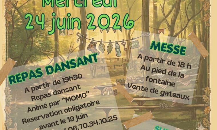 18h : Messe au pied de la fontaine suivie d'un repas dansant (sur réservation avant le 19 juin) dans les bois.