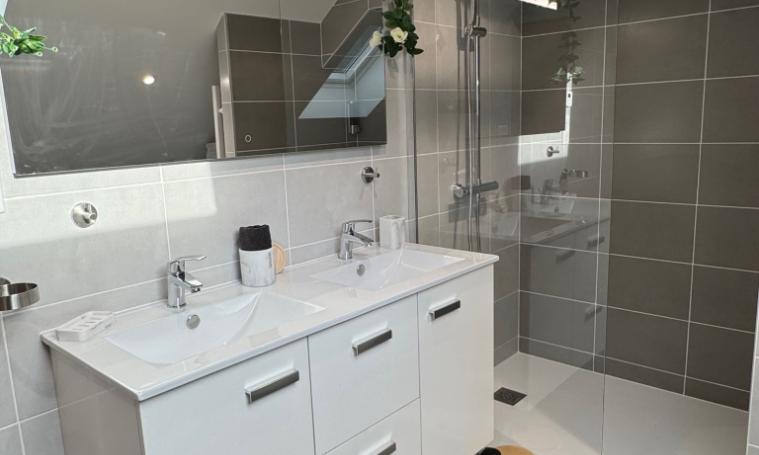 Dans la salle d’eau, une vaste douche à l'italienne et une double vasque.