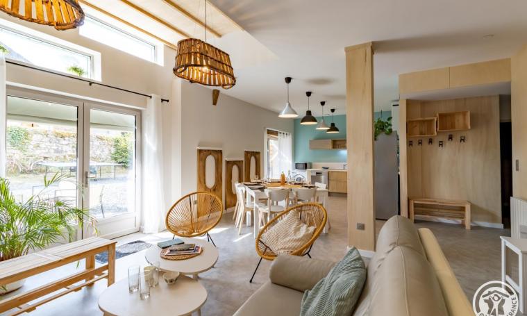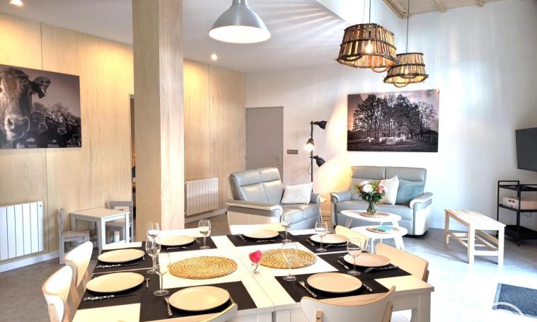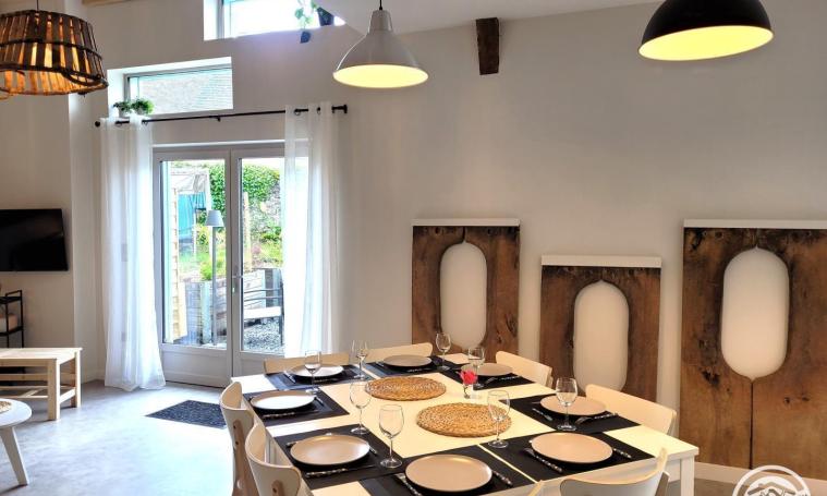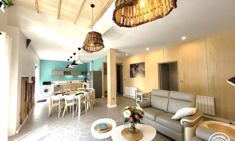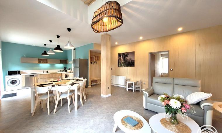 Le gîte de la Grange se compose: Sur le même niveau: Une grande et lumineuse pièce de vie avec cuisine aménagée et équipée, un salon/salle à manger. 3 chambres : une avec un lit double de 140 avec bureau , une seconde avec lit double de 160 et une troisième avec un lit superposé lits de 90 et 2 couchages supplémentaires pouvant accueillir 2 enfants. Une salle d'eau et un WC indépendant. Terrasse, Wifi, enceinte connectée...