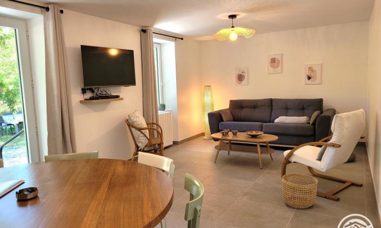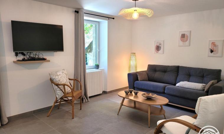 Ce charmant gite en pierre se compose au rez-de-chaussée d'une grande pièce de vie avec salon, salle à manger et cuisine, d'une salle d'eau, d'un WC indépendant et d'une pièce détente avec Jacuzzi 5 places, baby-foot et jeux de fléchette. A l'étage, vous disposerez de 3 chambres : deux avec un lit double de 140x190 et une avec un lit gigogne de 90x190 pouvant accueillir 1 personne supplémentaire, ainsi que d'une salle d'eau avec WC. Vous profiterez à l'extérieur d'un jardin de 1 000m², d'une terrasse et d'un parking dans la propriété.