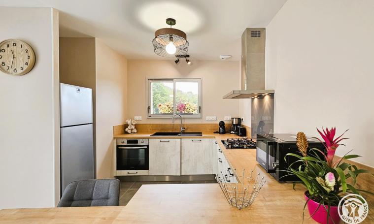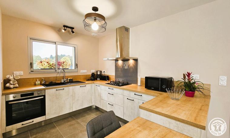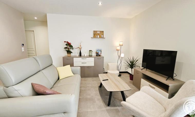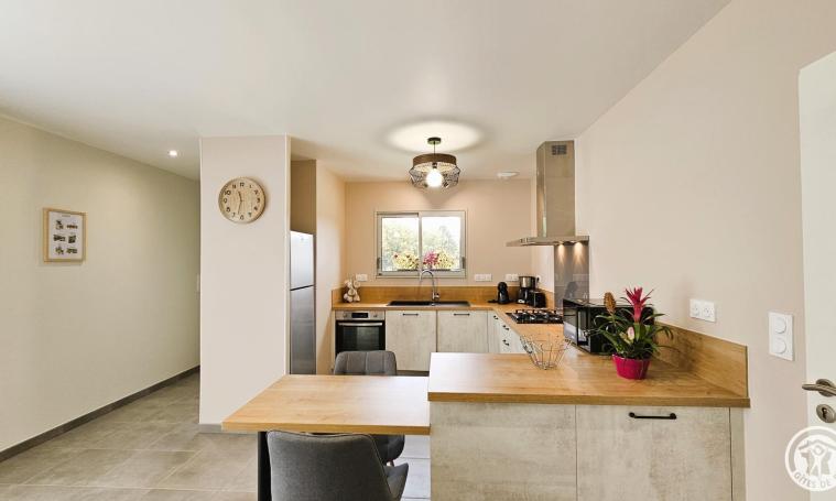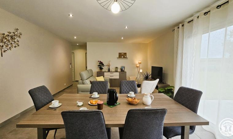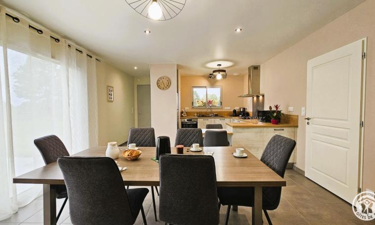 Venez découvrir ce gîte contemporain de plain-pied, avec son salon spacieux et sa grande baie vitrée ouverte sur la terrasse. La cuisine est entièrement équipée. Le gîte comprend une chambre avec un lit 140 cm, dotée d'une douche à l'italienne et d'un lavabo. Puis, une seconde chambre équipée d'un lit de 160 cm, ainsi qu'une dernière chambre avec deux lits jumeaux de 90 cm, qui peuvent être facilement rapprochés selon vos besoins. Pour votre confort, une salle d'eau indépendante avec une douche à l'italienne est également à disposition, ainsi qu'un WC séparé avec un lave-mains. Le garage attenant vous offre un espace pratique pour le stockage de vos vélos ou motos, vous permettant d'explorer les environs en toute liberté. Le tout sur un terrain plat de 1500 m². Ce qui n'est pas inclus dans le prix : Le linge de lit et le linge de toilette (aucune option de location disponible) Le ménage de fin de séjour (au tarif de 80€)