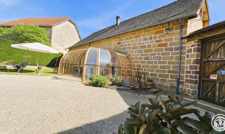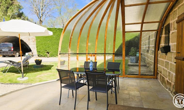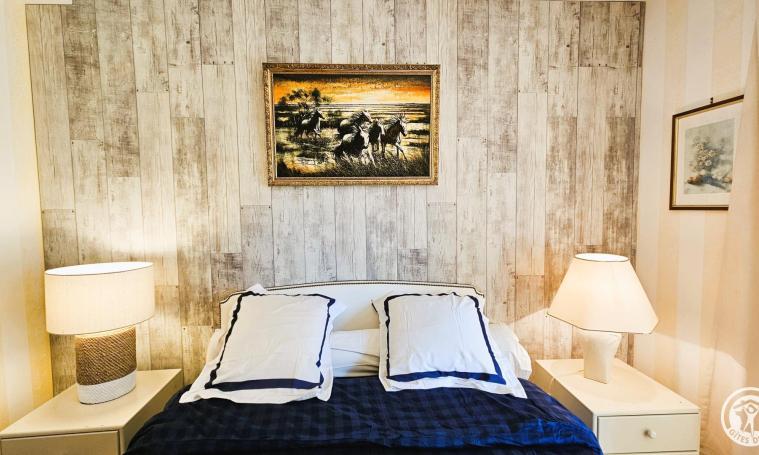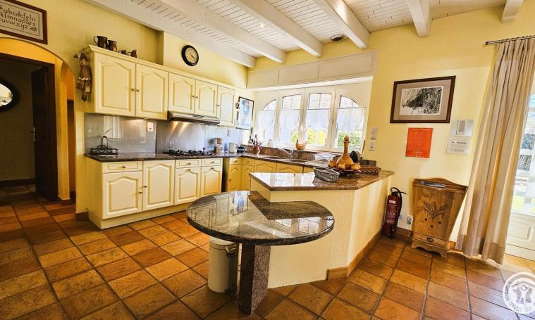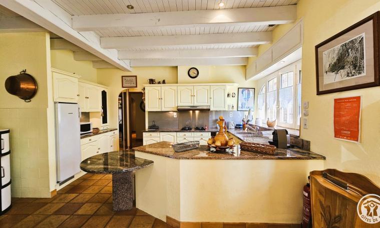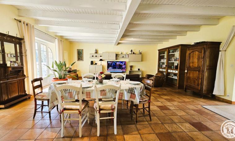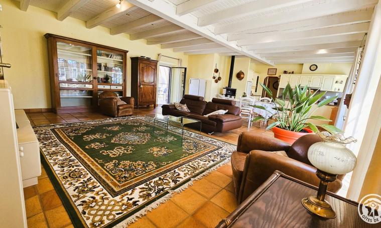 Le gîte s'ouvre sur une entrée protégée par un dôme de type véranda, qui mène à un salon/séjour spacieux équipé de canapés, fauteuils, poêle à bois, télévision, bibliothèque et d'une table avec ses chaises pour les repas. Cet espace lumineux, doté d'une climatisation mobile pour plus de confort, s'ouvre directement sur la cour arrière. La cuisine ouverte, parfaitement équipée, offre un espace fonctionnel et agréable pour préparer les repas. Au rez-de-chaussée, une chambre avec lit Queen size (160 cm) bénéficie d'un accès direct à la cour par une porte-fenêtre. La salle de bains est équipée d'une douche et d'une baignoire avec WC intégré, tandis qu'un second WC indépendant complète les installations. Au premier étage, une immense chambre de 103 m2 comprend deux lits de 90 cm, un lit Queen size (160 cm) et un dressing central. Des canapés et fauteuils aménagent un coin détente au sein de cet espace généreux, offrant confort et luminosité, et la climatisation mobile pour un confort opti