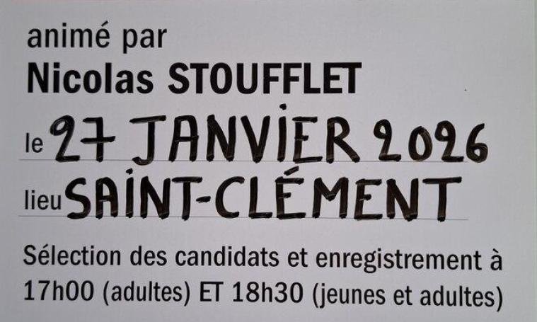 Saint Clément accueille la mythique émission de France Inter, le jeu des 1000€ le 27 janvier. Les enregistrements se feront à la salle polyvalente. La sélection des candidats se fera à partir de 17h pour les adultes et 18h30 pour jeunes ( 12 à 18 ans) et les adultes. L'entrée est libre et gratuite dans la limite des places disponibles. Les enregistrements seront diffusés dans la semaine du 16 au 20 février à 12h45, du lundi au vendredi