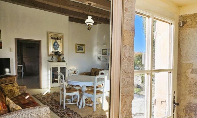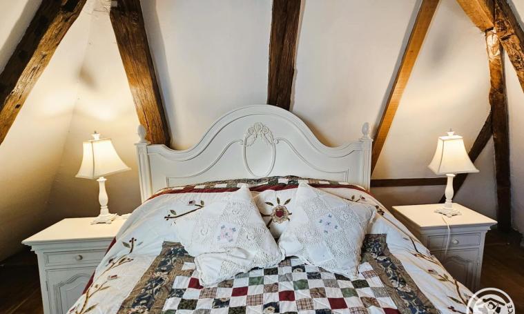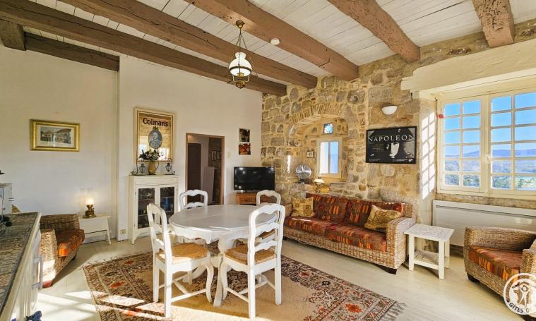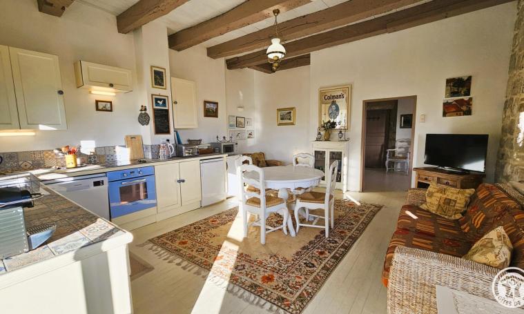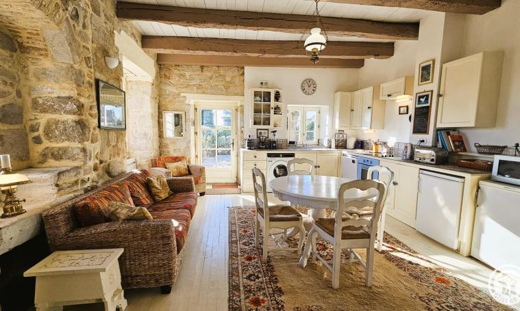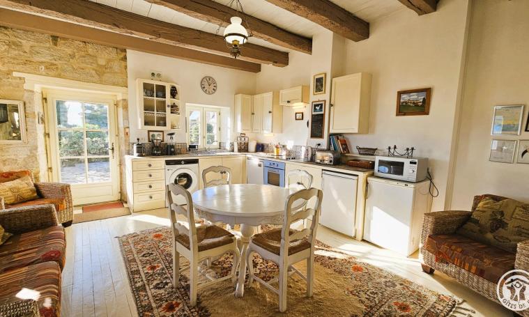 Le gîte est accessible par un escalier en hélice en pierre menant à un espace de vie comprenant une cuisine entièrement équipée (réfrigérateur, congélateur, lave-linge, lave-vaisselle, micro-ondes, four, plaque à induction, hotte, cafetière à filtre, cafetière à dosettes "Krups", grille-pain, bouilloire) et un séjour avec télévision. La salle de bains avec WC se trouve au rez-de-chaussée pour plus de confort. À l'étage, se trouvent deux chambres : l'une avec un lit double de 140 cm, et l'autre, accessible par quelques marches, équipée d'un lit double de 160 cm. À l'extérieur, vous pourrez profiter du salon de jardin, du barbecue, ainsi que de la proximité d'un restaurant situé à seulement 500 mètres.