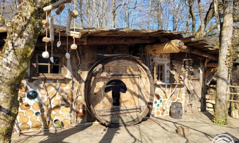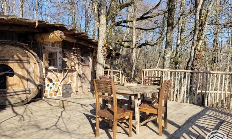 Le Terrier est une cabane semi-enterrée cachée dans la forêt et surplombant une prairie. Fraîche même en été et avec son poêle à bois l'hiver, vous vous sentirez tout en sécurité. Construite en bois cordé et chanvre/chaux, ses 3 puits de lumière éclairent son intérieur rustique et confortable et met en valeur sa décoration naturelle. Ses deux terrasses sont abritées par des chênes, des hêtres, des pins et des bouleaux. Le bruit de l'eau du ruisseau en contrebas invite à la détente et au calme intérieur. Éclairage aux chandelles & lampes LED, Poêle à bois. Barbecue commun à la table de Partage. Toilette sèche