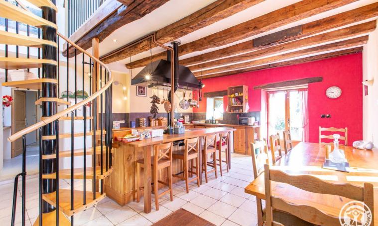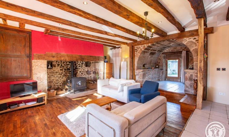 RDC grand salon avec poutres 33m2, large cheminée ,voute en pierre, cuisine équipée avec bar ouverte sur salle à manger 37m², WC. TV, DVD. Etage: 2 chambres poutres apparentes 15 et 17 m² (Lits 180x200), espace bureau 13 m², possibilité lit d'appoint, salle d'eau (douche double) avec WC. Terrasse extérieure pierres. Puits en pierre, jardin vue sur les près et forêts 1000 m² accessibles si la grange attenante qui est un gîte n'est pas louée séparément. Sinon partie de jardin réservée de 300 m2 Électricité: Forfait de 40KW/ jour (période 01/10-31/03) 15 autre période ,facturé au-delà Certaines options sont non comprises dans le prix (suppléments à prévoir) La location peut être couplée avec la grange ( annonce 19G10351 -avec maximum 21 personnes +BB) et l'ensemble est modulable Loc. 4 nuits minimum. RENSEIGNEZ VOUS