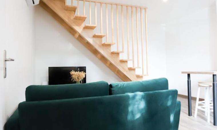 Elle est disposée comme suit : L'entrée se fait par une pièce de vie ouverte et climatisée, avec cuisine et salon. La cuisine est équipée d'un four, un frigo, un micro-ondes, une plaque de cuisson ainsi que d'un lave-linge. Vous trouverez également une cafetière Nespresso, une bouilloire et un grille-pain. Un escalier vous mène sur un pallier qui dessert deux chambres climatisées et une salle de bain La chambre verte dispose d'un grand lit 160x200, d'une commode et d'un espace de travail avec un bureau. La chambre terracotta dispose d'un lit 140x200 et d'une commode. La salle de bain est équipée d'une douche, d'un WC et d'un meuble avec double vasque. A deux pas de la gare de Brive la Gaillarde. TOUT INCLUS Le prix comprend : Électricité Chauffage Linge de maison Linge de lit Linge de toilette Forfait ménage en fin de séjour
