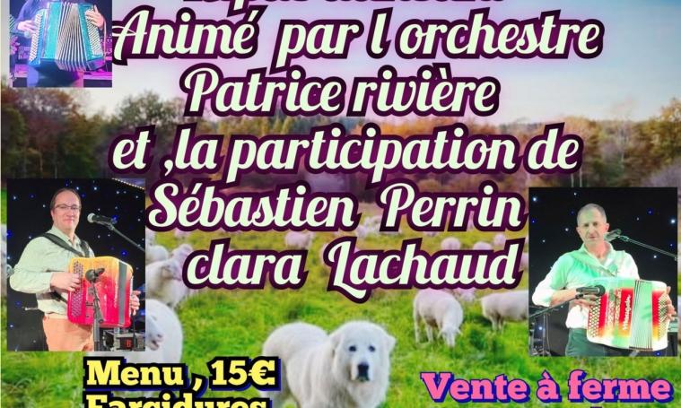 Repas dansant animé par l'Orchestre Patrice Rivière et la participation de Sébastien Perrin, Clara Lachaud - Menu : 15 € : Farcedures - Andouille et petit salé - Fromage - Tarte aux pommes - Vente à la ferme - Paint cuit au feu de bois - 3 producteurs locaux - Jeux pour les enfants - Maquillage - Chasse aux oeufs - Baptème en quad -