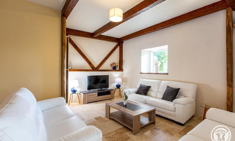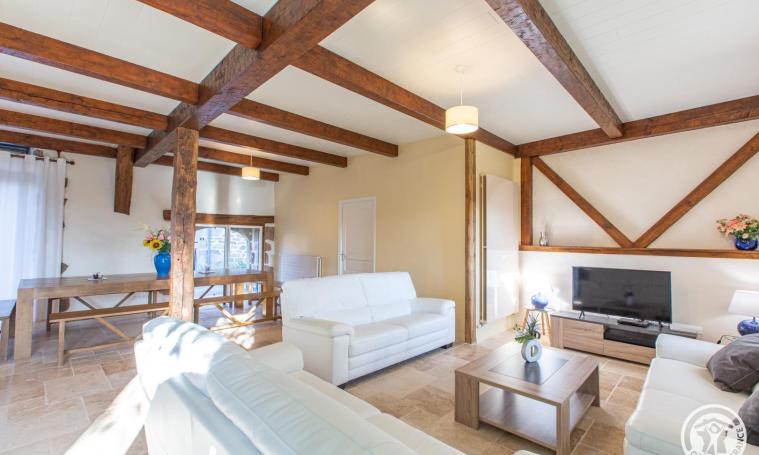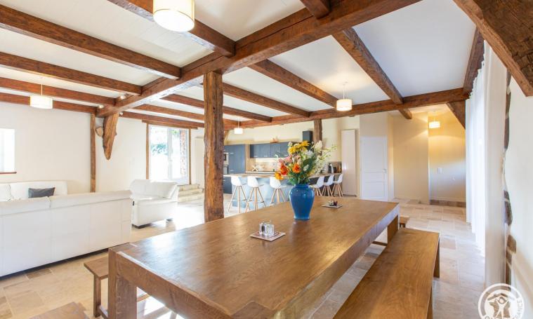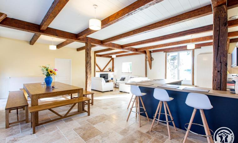 RDC : grande pièce à vivre (86m²), poutres apparentes, salon/salle à manger grande table en chêne , cuisine ouverte entièrement équipée. Chambre 18 m² (lit 160*200) 1 SDB avec douche. accessible fauteuil roulant jardin et terrasse accessible aux personnes en fauteuil roulant Etage mansardé : Salon/bibliothèque 14 m² (2 chauffeuses lit), 2 chambres (lit 160*200) 12 et 14 m² (suite parentale) et un dortoir 24m² avec 4 lits superposes 3 lits d'appoint Terrasse extérieure, puits en pierre .Jardin 1000 m2 (700 si chaumière mitoyenne occupée) Des suppléments sont à prévoir pour cette location La location peut être couplée avec la chaumière attenante (annonce 19G1035 - 21 personnes + BB possible) et l'ensemble est modulable. Loc. minimum 4 nuits.