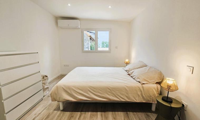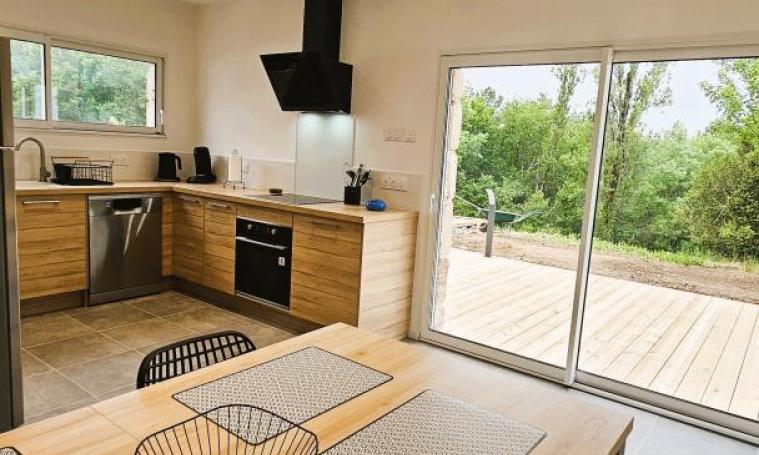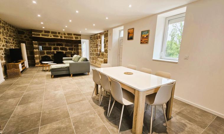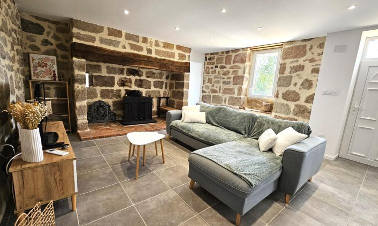 Dès votre arrivée, vous serez charmé par une belle terrasse en bois qui mène à un gîte entièrement rénové. Au rez-de-chaussée, un spacieux salon/séjour vous attend, agrémenté d'un poêle à bois dans une cheminée en pierre, d'une grande table à manger, de chaises, ainsi que d'un canapé convertible et d'une table basse. La cuisine intégrée de qualité dispose d'une vaste baie vitrée offrant une vue agréable sur la terrasse. Vous y trouverez également une chambre avec douche à l'italienne et un WC indépendant. À l'étage, deux chambres vous accueillent : l'une avec un lit de 140 cm et l'autre avec un lit de 90 cm. Pour votre confort, une salle d'eau avec douche à l'italienne et un WC commun sont à votre disposition, ainsi qu'une climatisation réversible dans chaque pièce. Nous attendons également que le gazon pousse après les travaux, et à côté du gîte se trouve une grange inoccupée appartenant au propriétaire.