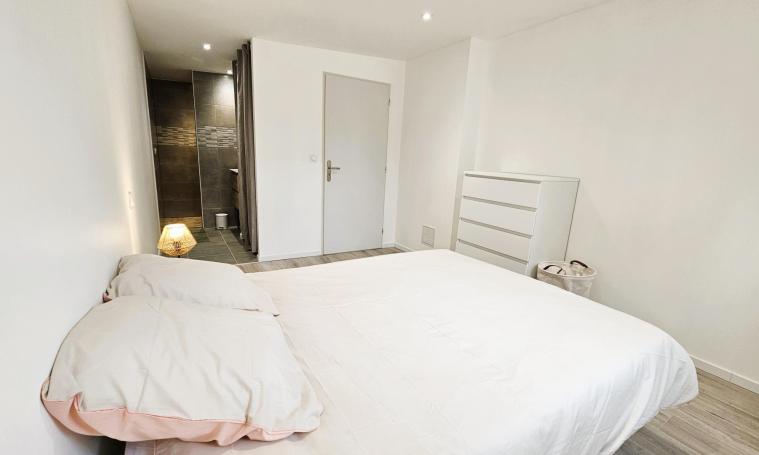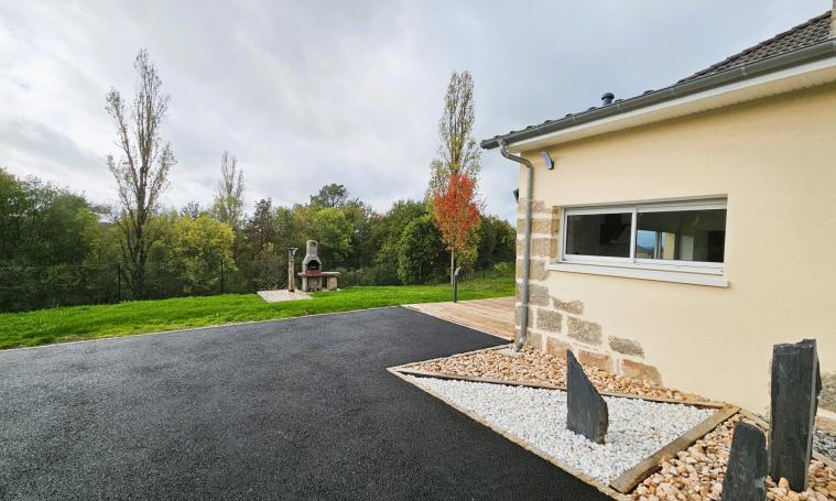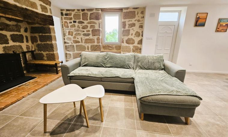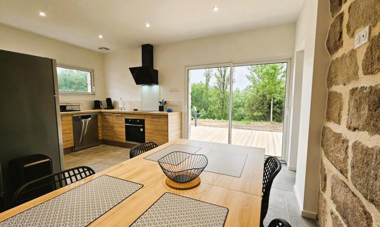 Dès votre arrivée, vous serez charmé par une belle terrasse en bois qui mène à un gîte entièrement rénové. Au rez-de-chaussée, un spacieux salon/séjour vous attend, agrémenté d'un poêle à bois dans une cheminée en pierre, d'une grande table à manger, de chaises, ainsi que d'un canapé convertible et d'une table basse. La cuisine intégrée de qualité dispose d'une vaste baie vitrée offrant une vue agréable sur la terrasse. Vous y trouverez également une chambre avec douche à l'italienne et un WC indépendant. À l'étage, deux chambres vous accueillent : l'une avec un lit de 140 cm et l'autre avec deux lits de 90 cm. Pour votre confort, une salle d'eau avec douche à l'italienne et un WC commun sont à votre disposition, ainsi qu'une climatisation réversible dans chaque pièce. Nous attendons également que le gazon pousse après les travaux, et à côté du gîte se trouve une grange inoccupée appartenant au propriétaire.
