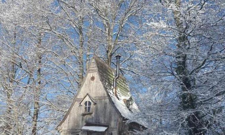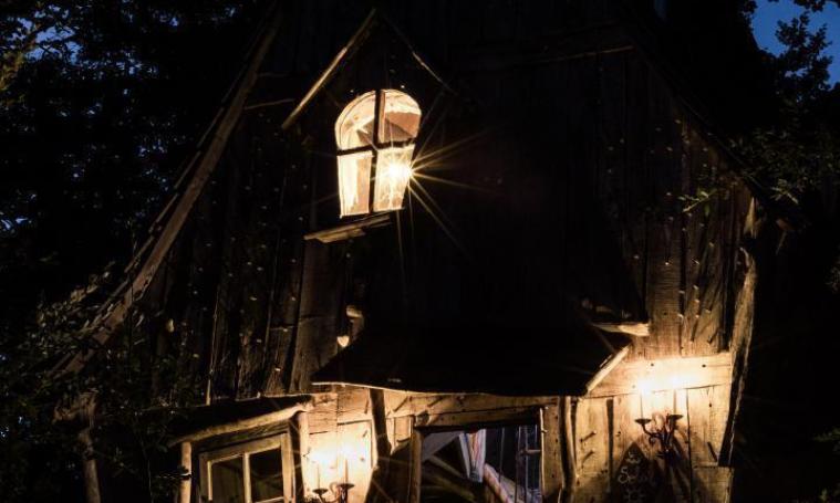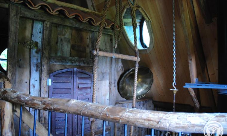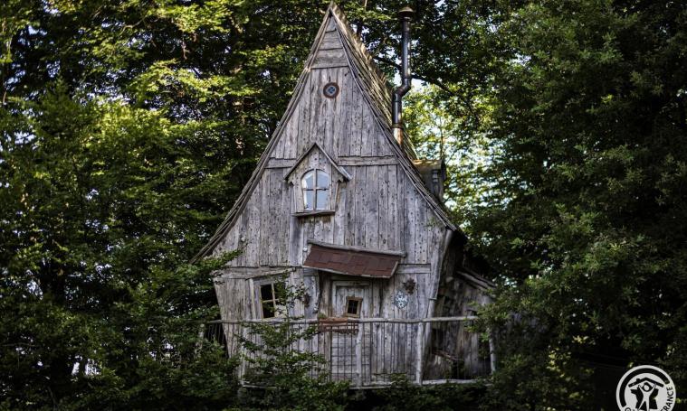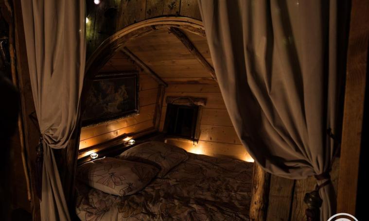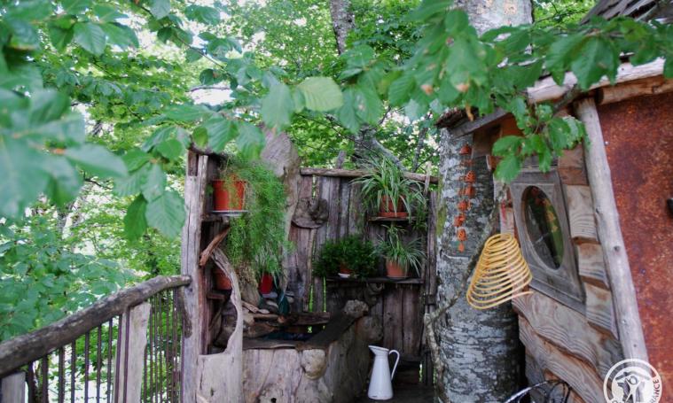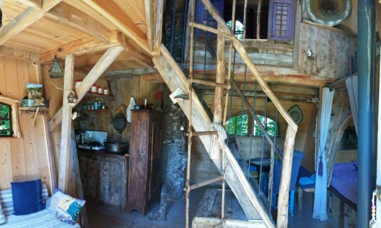 La cabane du Soleil est la plus féérique avec son toit en forme de chapeau de sorcière. Ludique, magique, au bout d’un chemin forestier au milieu de nulle part, on y accède par un pont Népalais. Elle inspire les rêves et l’imaginaire… L’été, sur sa terrasse dans les branches du hêtre, est installé un petit bassin entouré de plantes. Du balcon, vous aurez une vue imprenable sur la prairie et la forêt.