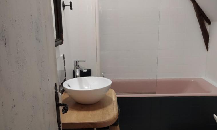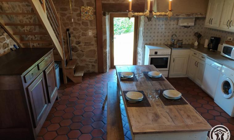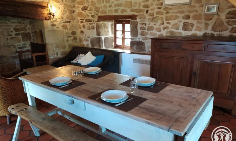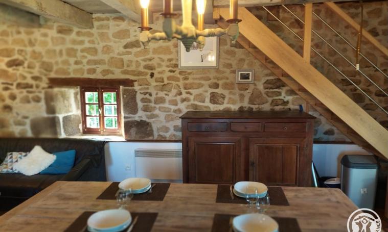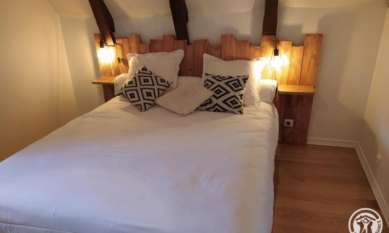 Le gite se compose au rez-de-chaussée d'une salle de séjour avec coin cuisine et un four à pain. A l'étage, vous trouverez les 2 chambres : l'une avec un lit en 140 et l'autre avec un lit en 160, ainsi que la salle de bain avec baignoire et WC. A l'extérieur, vous pourrez profitez d'un terrain boisé de 10 ha (avec de nombreux jeux pour petits et grands : balançoire, cages de foot, filet de badminton, table de ping-pong...) et de l'agréable piscine commune avec la propriétaire (dimensions 4x8 m - profondeur de 1m10 à 1m 60), ouverte de mi-juin à mi-septembre et sécurisée par une barrière. Le terrain autour du gite est entièrement clos pour la sécurité des plus petits et de nos amis les animaux.