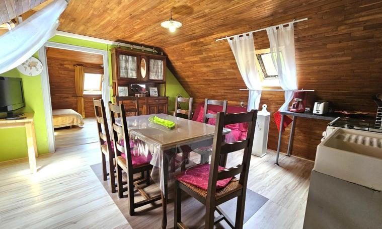 Maison de pays, typiquement corrézienne avec un accès indépendant à celle du propriétaire. Au rez-de-chaussée, le gîte "Les Hortensias" dispose d'un salon avec poêle à bois (bois offert) et d'une salle de douche avec WC. Au premier étage, une cuisine équipée de réfrigérateur, congélateur, four, micro-ondes, cafetière à filtre, grille-pain, bouilloire et les deux chambres en enfilade équipées de la climatisation réversible, l'une avec un lit double de 140cm et la deuxième avec 1 lit double de 140 et 1 lit simple de 90.