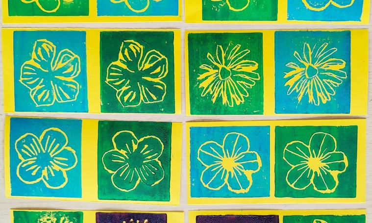 Réalisation d'une carte colorée avec la technique de la linogravure. Après avoir choisi un motif, l'avoir reproduit sur du papier calque, il s'agit de le creuser sur une plaque de linoléum avec une gouge, puis d'étaler la couleur au rouleau encreur sur cette matrice, et enfin de l'imprimer sur du papier.