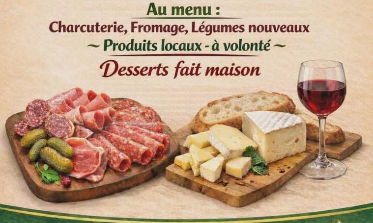 Menu : Charcuterie - Fromage - Légumes nouveaux - Produits locaux à volonté - Dessert fait maison - Tarifs : 20 € /pers et 8 € - de 12 ans - Sur réservation -
