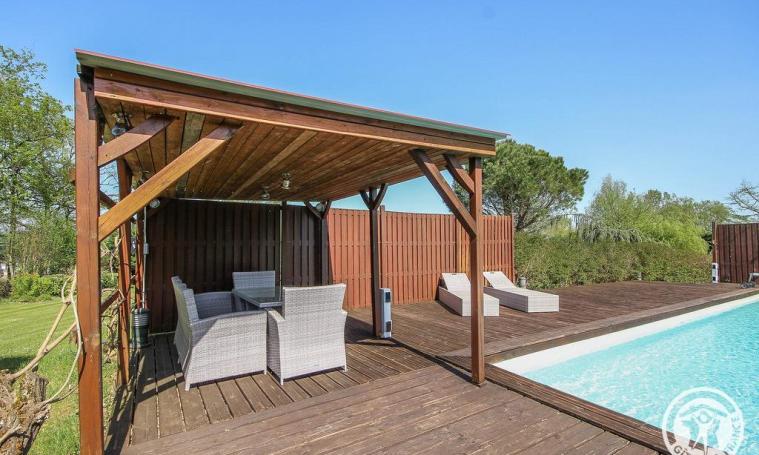 La maison se compose d'un grand séjour confortable, salon/salle à manger ouvert sur une cuisine entièrement équipée avec accès à un cellier/buanderie où se trouve un second frigo (américain), un lave-linge ainsi qu'un sèche linge. A l'étage, une suite parentale avec un lit double 160cm avec literie électrique (2x80cm) et à mémoire de forme, avec balcon/terrasse, dressing, télévision et sa salle de bain attenante avec baignoire Balnéo Jacuzzi. Au rez de chaussée une chambre avec un lit 1 personne 90cm, une chambre avec un lit double de 140cm et une salle d'eau avec douche à l'italienne. A l'extérieur, 2 terrasses et une piscine (au sel, 12mx6m). Coffre fort à disposition. Possibilité de commander des repas au "Bistrot de pays". Électricité, Ménage, draps, linge de toilette compris dans le prix de la location