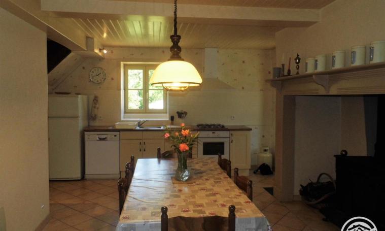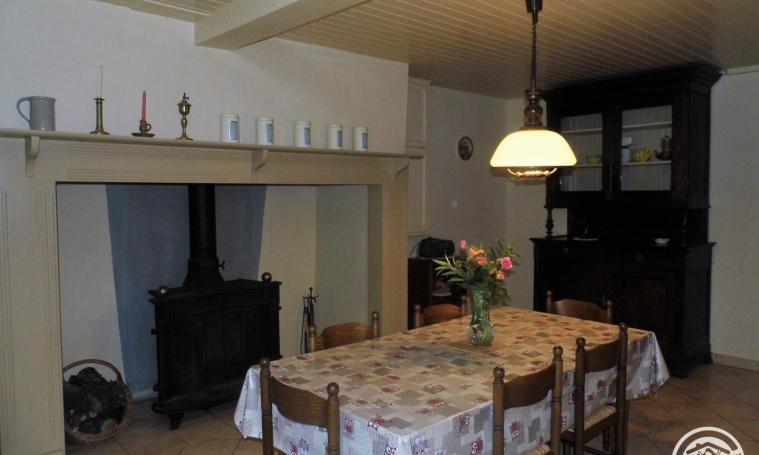 Vous accéderez à l'intérieur de ce gîte après quelques marches. Il est composé d'une grande pièce ouverte sur la cuisine entièrement équipée (four, micro-ondes, gazinière, frigidaire, lave-vaisselle, lave-linge...) avec poêle à bois. Un petit salon avec canapé (non-convertible) et TV. Sur le même niveau, le gîte dispose de deux chambres, chacune avec 1 lit 2 personnes en 140. Une salle d'eau (douche), WC indépendant.