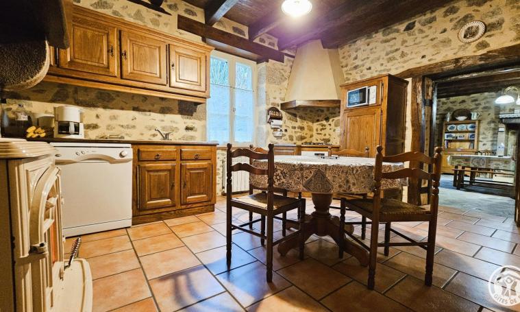 Au rez-de-chaussée, vous découvrirez un salon et une salle à manger chaleureux, aménagés dans un espace convivial avec un poêle à bois intégré dans un cantou. La pièce comprend une grande table avec des bancs, des fauteuils, une table basse et une télévision. La cuisine équipée, également dotée d'un poêle à bois, dispose d'une table avec des chaises ainsi que d'appareils électroménagers tels qu'un lave-vaisselle, un réfrigérateur, un micro-ondes, un four, une plaque de gaz, une hotte, une cafetière à filtre, un grille-pain et une bouilloire. La salle de bain et un WC indépendant complètent cet étage. À l'étage, se trouvent trois chambres : la première équipée d'un lit de 140 cm, la deuxième avec un lit de 90 cm, et la troisième, plus spacieuse, comprenant un lit de 90 cm, des fauteuils et une télévision, offrant un espace idéal pour se détendre. Chauffage non inclus. Les draps et le linge de toilette ne sont pas disponibles à la location.