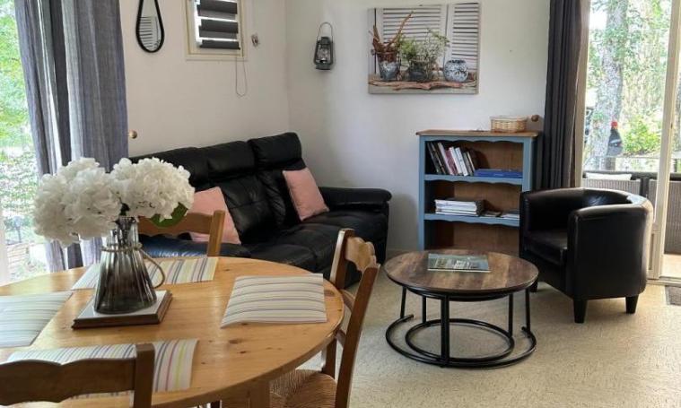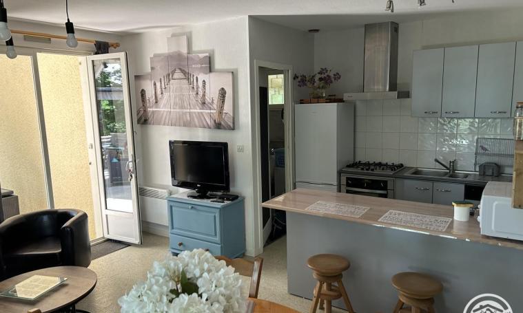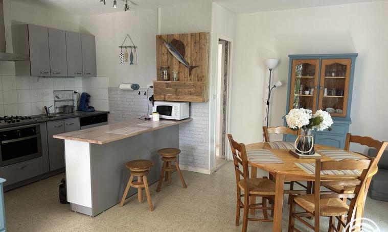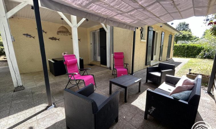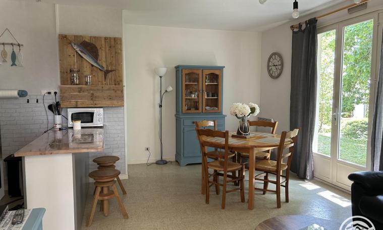 Il comprend une grande pièce à vivre de 35 m² avec salon, salle à manger et cuisine tout équipé. Une chambre avec un lit de 140x190. Une seconde chambre avec au choix soit un lit 160x190 soit deux petits lits de 80x190 (à préciser lors de la réservation). Une salle d'eau avec douche à l'italienne et un lavabo. Un wc indépendant. Un coin buanderie dans le garage avec une machine à laver et un sèche-linge. A votre disposition : équipement bébé avec rehausseur de chaise, baignoire, matelas à langer, lit parapluie et son matelas, pot. A l'extérieur : plancha, barbecue, hamac, chaises longues, salon sous pergola et table pour déjeuner sur terrasse couverte.