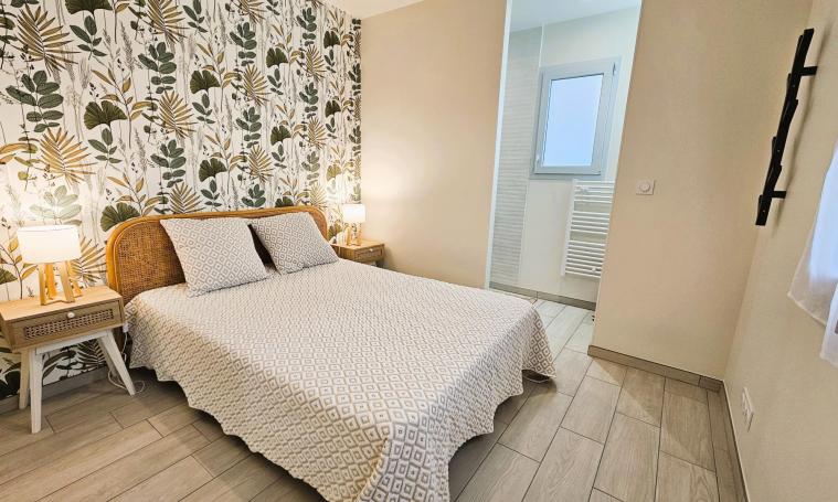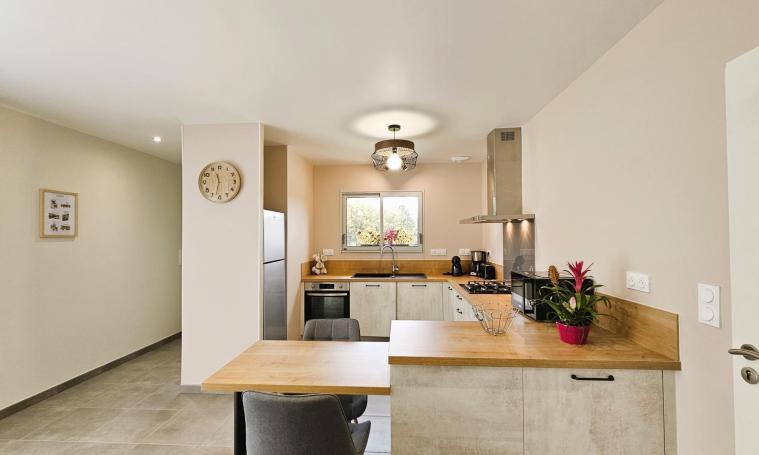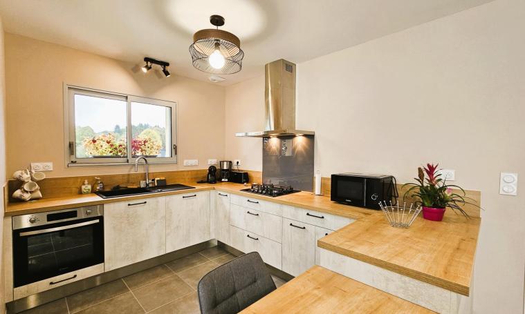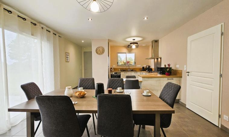 Venez découvrir ce gîte contemporain de plain-pied, avec son salon spacieux et sa grande baie vitrée ouverte sur la terrasse. La cuisine est entièrement équipée. Le gîte comprend une chambre avec un lit 140 cm, dotée d'une douche à l'italienne et d'un lavabo. Puis, une seconde chambre équipée d'un lit de 160 cm, ainsi qu'une dernière chambre avec deux lits jumeaux de 90 cm, qui peuvent être facilement rapprochés selon vos besoins. Pour votre confort, une salle d'eau indépendante avec une douche à l'italienne est également à disposition, ainsi qu'un WC séparé avec un lave-mains. Le garage attenant vous offre un espace pratique pour le stockage de vos vélos ou motos, vous permettant d'explorer les environs en toute liberté. Le tout sur un terrain plat de 1500 m².