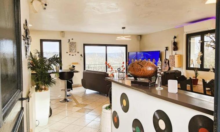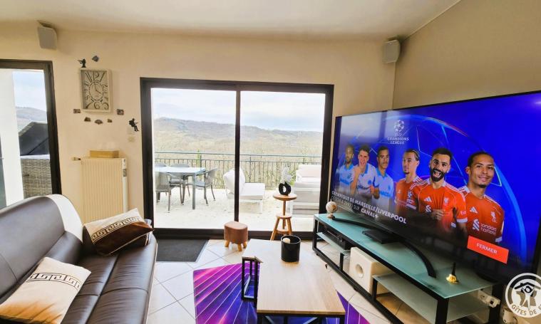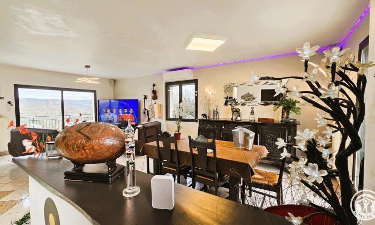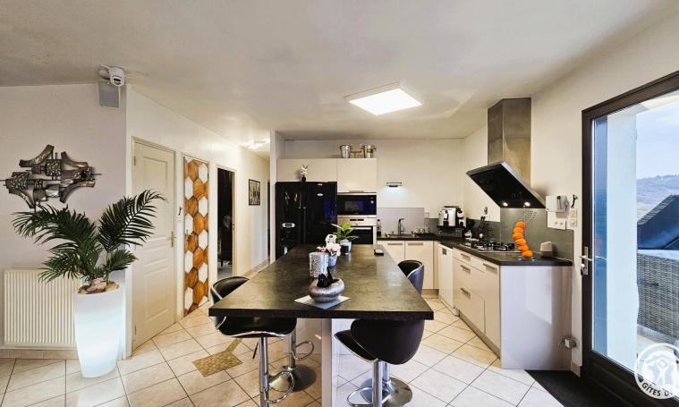 Gîte indépendant de plain-pied, avec portail automatique, offrant un cadre calme et ouvert sur la nature. La maison s'ouvre sur un vaste salon/salle à manger très lumineux, grâce à de grandes baies vitrées donnant un accès direct à une large terrasse. L'espace de vie se prolonge par une cuisine ouverte, moderne et parfaitement équipée, pensée pour un usage pratique au quotidien. Deux terrasses permettent de profiter de l'extérieur : l'une devant le salon, l'autre de l'autre côté du séjour, avec une agréable vue dégagée sur la vallée. Côté nuit, trois chambres accueillent confortablement jusqu'à 6 personnes : deux chambres avec un lit de 140 cm et une troisième avec deux lits de 90 cm. La salle de bains est équipée d'une baignoire, d'une douche et de deux lavabos. Entièrement de plain-pied, ce gîte est particulièrement adapté aux familles et aux personnes recherchant un hébergement facile d'accès, lumineux et fonctionnel, avec une belle ouverture sur l'extérieur.