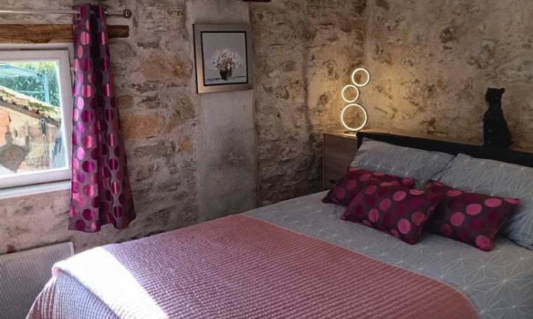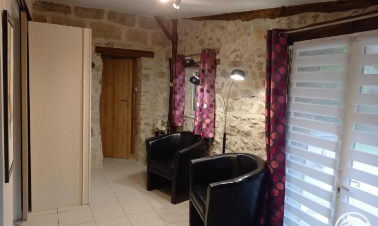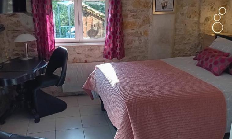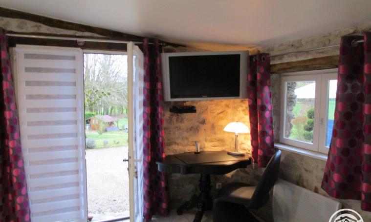 Ce gîte comprend une grande chambre qui vous séduira par ses murs en vieilles pierres, sa décoration personnalisée et par son confort. Son Lit 2 personnes (140cm) avec son matelas à mémoire de forme, ses 2 fenêtres avec moustiquaires ainsi que sa grande Télé à écran plat, son bureau et un coin salon avec 2 fauteuils . Une salle d'eau attenante avec douche à l'italienne et sèche-cheveux. Toilettes séparées. Une Cuisine équipée (micro-ondes, cafetière à filtres et cafetière à dosettes Senseo ...) avec porte intérieure directe de la chambre. Dans ce même espace, un canapé, télé écran plat et radio. Une grande table extérieure est réservée au gîte. Barbecue, plancha, salon de jardin sous pergola et transats sont à votre disposition dans ce grand terrain ombragé et clôturé. Parking couvert pour voiture dans la propriété.