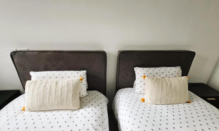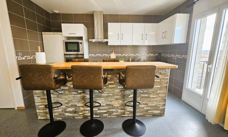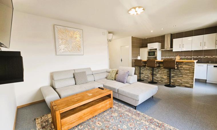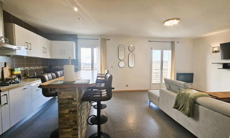 Au premier étage d'un immeuble, ces deux appartements adjacents peuvent accueillir jusqu'à 8 personnes. Chacun d'eux, très lumineux et d'une superficie de 65 m², offre un cadre de vie agréable. Ils sont aménagés de la même manière, comprenant deux chambres confortables : l'une avec un lit queen size de 160 cm et l'autre avec deux lits de 90 cm. Le vaste salon/séjour, baigné de lumière grâce à deux portes-fenêtres, est équipé d'un canapé convertible pour un couchage supplémentaire et offre une vue dégagée. La cuisine américaine intégrée, moderne et bien équipée, crée un espace convivial parfait pour vos moments de détente. Chaque appartement dispose également d'une salle d'eau avec douche à l'italienne, d'une toilette indépendante pour un confort optimal, et est équipé d'une climatisation réversible. TOUT INCLUS : Draps, serviettes de toilette, linge de maison, eau, électricité, chauffage et forfait ménage. TARIF DÉGRESSIF : A partir de 3 nuits, jusqu'à 5 nuits.