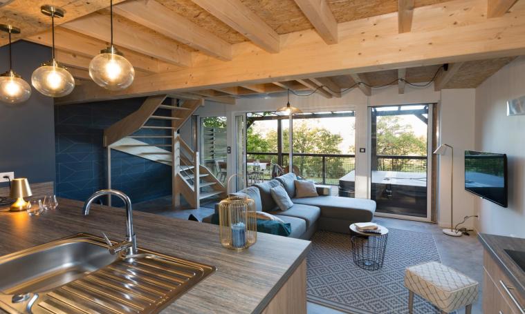 Au rez de chaussée, vous entrez dans le vestibule dit «la boite» avec son dressing. Vient ensuite la pièce à vivre, avec le poêle bois, le coin salon / TV, et l'espace cuisine toute équipée et la grande baie vitrée donnant sur la terrasse et son jacuzzi. A l'étage, vous dormirez dans 2 chambres avec lits modulables : au choix à la réservation : 1 lit double ou 2 lits simples. De larges baies vitrées vous permettent d'accéder à votre balcon donnant sur la forêt. Votre salle d'eau est composée d'une douche italienne de 120x80, d'un meuble salle de bain, d'un radiateur sèche serviette et d'un WC suspendu. Four - Four micro ondes - Lave vaisselles - Hotte aspirante – Réfrigérateur - plan de travail / table 5 places - Cafetière Nespresso - Bouilloire - Vaisselle – ... Le plus bien être Jacuzzi : drap de bain – Peignoir. Vestibule : dressing avec cintres et étagères. Draps fournis – lits faits a l'arrivée Aspirateur balai – Ampoule LED musicale Bluetooth.