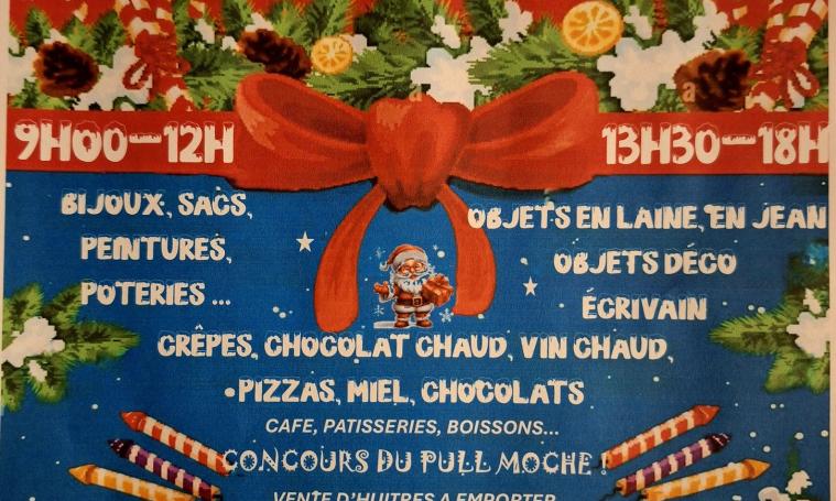 Objets en laine, objet déco, objets en jean. Écrivain, sacs, bijoux, peinture, poterie. Crêpes, chocolat chaud, vin chaud, pizzas, miel, vin, chocolats. Le Père Noël sera présent toute la journée pour faire vos photos.