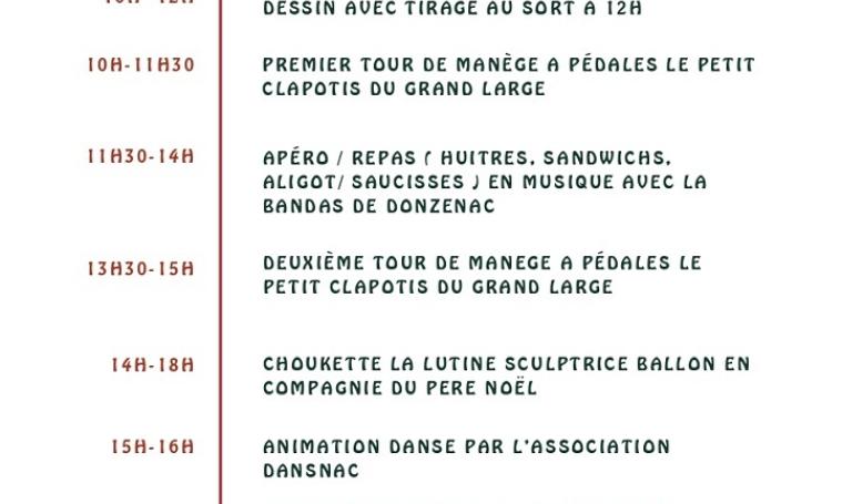 Des animations gratuites tout au long de la journée pour les enfants : manège, visite du père noel, lutine sculptrice de ballon, danse, maquilleuse, … Restauration : huîtres / sandwich / aligot saucisse, et buvette chaude et froide sur place.